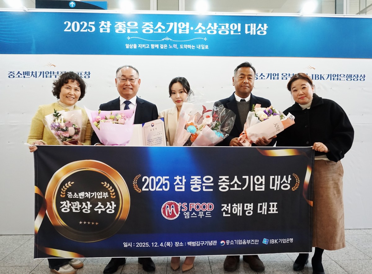 엠스푸드㈜ 전해명 대표가 12월 4일 백범김구기념관에서 열린 ‘2025 참 좋은 중소기업 대상’ 시상식에서 중소벤처기업부 장관상을 수상했습니다.